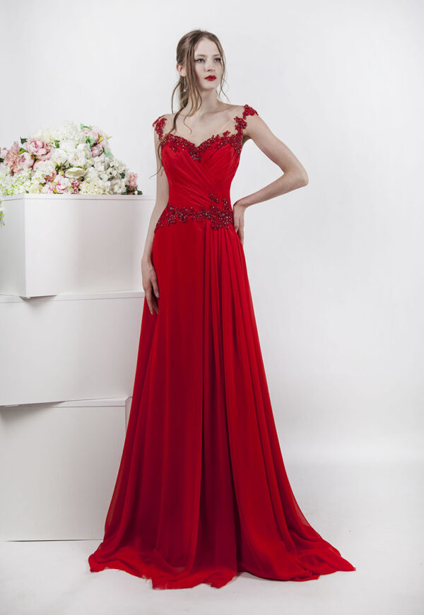 Elegance je vždy nadčasová a naše značka Zoryana Stekhnovych – Paris, dostupná také v Praze, se jí snaží dělat vždy jinak. Chceme totiž, aby naše elegantní společenské šaty byli zajimavé a neokoukané. Proto pracujeme vždy jen velmi inovačnímy technikami a používáme ty nejkvalitnější materiály. Co je také velmi důležité je to, že mnnoho detailů na společenských šatech které Vám nabízíme jsou propracovány ručně díky čemu působí velmi delikátně. Například i krajka kterou najdete na těchto červených splývavých šatech byla vyšívaná na šaty zcela ručně našim profesionálním týmem který si dává na kvalitě opravdu velmi záležet. To stejné platí i ohledně drapování jehož sklady jsou vždy fixované jenom zásadně ruční technikou aby působili opravdu delikátně. I drapování které zdobí také i sukni těchto společenských šatů červené barvy bylo vytvořeno ručně v našem ateliéru. Tyto elegantní společenské šaty jsou červené barvy. Vybrali jsme si právě tuto nádhernou a velmi luxusní barvu jelikož jsme chtěli aby tyto společenské šaty Praha vypadali ve výsledku opravdu velmi vášnivě a žensky. Dále mají tyto šaty jako vždy živůtek s korzetem díky čemu vytvoří jejich nositelce opravdu nádherný úzký pas a plné poprsí. V zádu má živůtek těchto společenských šatů z našeho salonu v Praze šněrování které je nejemom hezkým zdobením večerních šatů, ale je také velmi praktické jelikož se díky němu přizpůdobí tyto večerní šaty Vaší postavě. Pokud tak lehce zhubnete nebo naopak lehce přibererte, vůbec to nebude vadit a společenské šaty se Vám ihned krásně přizpůsobí. Jistě to určitě oceníte.
