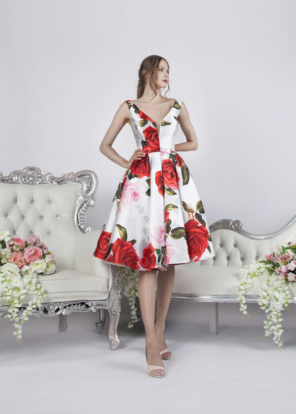 Zavítejte do našeho salonu v Praze a budete jistě okouzlená nádhernými společenskými šaty krátké délky které Vám nabízíme. Ty jsou vždy vytvořené návrhářkou Zoryanou Stekhnovych tak, aby podtrhli Vaší ženskost a Vaší něžnost. Kromě toho, krátké koktejlové společenské šaty z našeho salonu v Praze jsou vždy jen té nejvyšší kvality díky čemu se v nich budete vždy cítit velmi luxusně. Pokud tak i Vy hledáte společenské šaty krátké délky ve kterých se budete cítit jako opravdová princezna, určitě se musíte zastavit v našem salonu v Praze kde jistě naleznete přesně ty krátké společenské šaty na večer, o kterých již tak dlouho sníte. Co se Vám na těchto krátkých společenských šatech bude určitě líbit jsou nádherné květinové motivy. Jedná se totiž o látku které se říká mikádo. Tato látka se mnohdy velmi podobá saténu ale na omak je přeci jenom jiná a tím i jedinečná. Kromě toho, nejedná se jen tak o ledajaké mikádo. Toto mikádo má na sobě totiž nádherný květinový potisk plný růží. Díky tomu jsou tyto koktejlové společenské šaty Praha tak moc originální a naprosto jedinečné. Také díky tomuto mikádu mají tyto krátké společenské šaty velmi zajímavý tvar a formu. Živůtek těchto koktejlových květinových šatů je obepínající aby tak krásně poukázal Vaší ženskou a něžnou siluetu. Tyto společenské šaty na svatbu Praha mají také velmi hezký sexy hluboký dekolt který se Vám také jistě bude velmi líbit. Všimněte si také krásných elegantních ramínek díky kterým budou koktejlové šaty s květy držet krásně na svém místě. Tyto ramínka jsou širší a pak se pomalu zužují směrem k Vašim ramenou tak, aby vypadal celý výsledek krásně harmonicky.